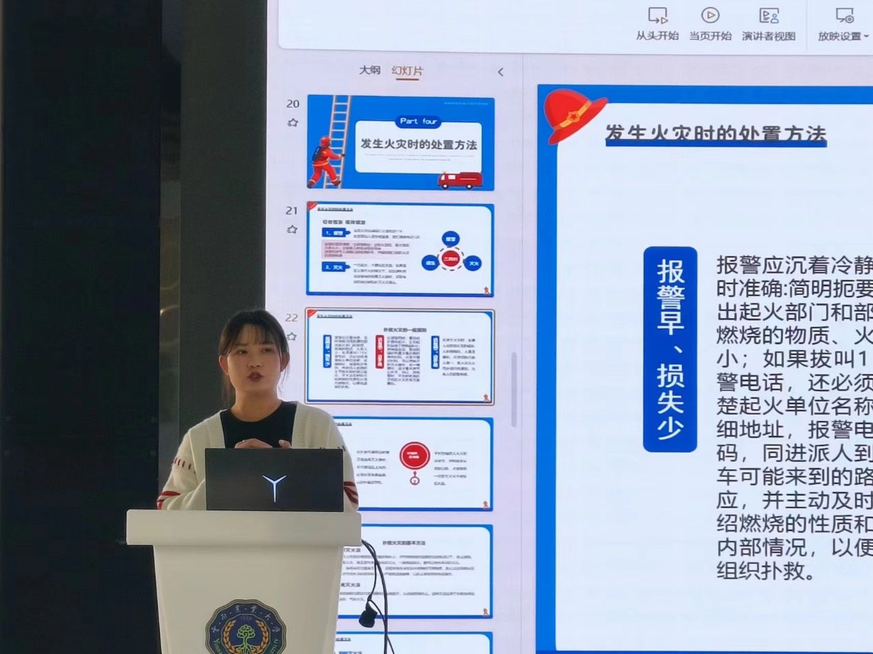 講座中,柳錦結合近年來校園內及周邊發生的典型火災案例,深入分析火災原因、危害及預防措施。通過大量翔實的數據、圖片、視頻等資料,從校園火災及其預防、發生火災時的處置方法和常用滅火器的使用等方面詳細講解了校園常見的消防安全隱患和防范措施,重點強調了在突發火災時的應急逃生技巧。活動現場柳錦與同學們積極進行互動交流,并就提出的問題進行詳細解答。